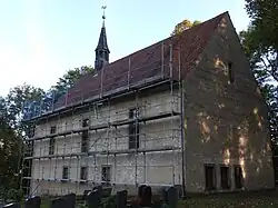 1958 brannte die Kirche bis auf die Grundmauern ab. Unter starkem Einsatz der Gemeinde und unter „teilweise ungünstigen Bedingungen“ erfolgte bis 1964 der Wiederaufbau, als „moderne, schlichte Kirche“ mit einem kleinen Dachreiterturm. Von der alten Kirche steht noch ein Fachwerkanbau, der früher den Aufgang zur Patronatsloge enthielt und heute Sakristei ist.