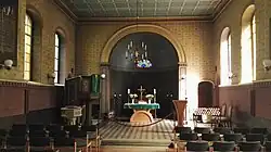 Im Jahr 1887 wurde das Kirchenschiff beträchtlich nach Osten verlängert und eine eingezogene Apsis wurde angebaut. Beide Seiten des Langhauses haben im Westen zweigeschossige kurze Anbauten. Die Schlusssteine der Fenster- und Portalfaschen sind mit Palmwedeln und Christusköpfen aus dem 19. Jahrhundert verziert.