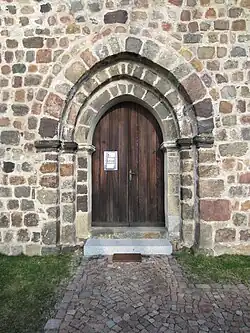 Am Eingang zum Friedhof steht noch ein breites, leicht spitzbogiges Portal aus spätgotischer Zeit.