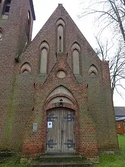 Das Bauwerk wurde aus rötlichem Mauerstein im Stil der Neogotik errichtet. Der Chor ist gerade und eingezogen. In etwa auf mittlerer Höhe ist ein großes kreisförmiges Fenster, das mit einem Gitter vor Beschädigungen geschützt wird. Es zeigt Abel als Hirte. Seitlich sind zwei Strebepfeiler, die das Bauwerk statisch stabilisieren. Der Giebel ist ebenfalls aus rötlichem Mauerstein errichtet. In der Mitte dominiert ein großes Kreuz, das als Blende in den Giebel eingelassen ist. Es wird von je einer seitlich angebrachten, spitzförmigen Blende ergänzt.