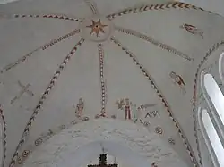 Die Kirche ist ein zweijochiger Feldsteinsaal mit eingezogenem quadratischen Chor und vollständig mit Domikalgewölben überdeckt. Sie besitzt im Innenraum noch ihre ursprüngliche Ausmalung. Diese konnten im Zuge von Gewölbesicherungsarbeiten frei gelegt werden. Die teilweise vorgeritzten und zum Teil freskal aufgebrachten Gewölbemalereien weisen einen überwiegend guten Erhaltungszustand auf. Die figürlichen und ornamentalen Darstellungen besitzen einen hohen liturgischen Symbolgehalt. Die 2008 begonnene innerer Renovierung konnte 2009 mit der qualitätsvollen Restaurierung der Gewölbemalereien abgeschlossen werden.[18]