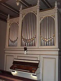 Das Instrument verfügt über acht Register auf einem Manual und Pedal mit mechanischer Kegellade.[4]