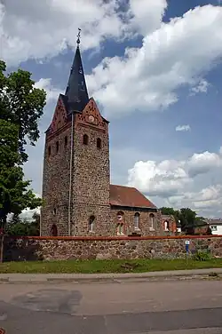 Die Feldsteinkirche wurde Mitte des 13. Jahrhunderts gebaut. Sie bestand aus einem Langhaus, einem querrechteckigen Kirchturm im Westen und einem eingezogenen Chor mit breiter halbrunder Apsis im Osten. Seit der Zerstörung 1945 sind Chor und Apsis nur als Ruinen erhalten. Der mit einem hohen, spitzen, schiefergedeckten Helm bedeckte Kirchturm, dessen Giebel mit Blenden verziert und mit Backsteinen abgeschlossen sind, und der Westteil des mit einem Satteldach bedeckten Langhauses, das im Innenraum mit einer verputzten Flachdecke überspannt ist, wurden 1966 wiederhergestellt.