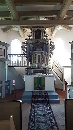 Die Hufeisenempore steht auf schlanken Pfosten und ist im Nordosten durch einen Gang mit dem Altar verbunden. Das Bauwerk ist in seinem Innern flach gedeckt. Nördlich des Bauwerks erinnert ein Mahnmal an die Gefallenen der Weltkriege.