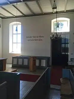 An der nördlichen Seite des Kirchenschiffs ist im Innern ein Vers aus dem Evangelium nach Matthäus angebracht: „Himmel und Erde werden vergehen; aber meine Worte werden nicht vergehen.“ (Mt 24,35 ). Auf der gegenüberliegenden Seite ist ein Vers aus dem Brief des Jakobus zitiert: „Seid aber Täter des Worts und nicht Hörer allein[, wodurch ihr euch selbst betrügt.]“.