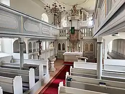 Zum Neubau der Kirche 1732 wurden Prinzipalien und Orgel dorthin umgesetzt. Die Ausmalung und Restaurierung des Deckengemäldes mit der Himmelfahrt Christi erfolgten 1898 durch Baurat Schramm aus Dresden, der auch für Erneuerungsarbeiten in der Bergkirche Schleiz verantwortlich war. Bei einer Renovierung Ende der 1950er Jahre wurde es übermalt, der Innenraum neu verputzt, der Boden gedielt, die Fenster erneuert und im vorderen Bereich eine Sakristei eingerichtet.[2]