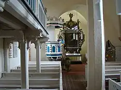 Die Kanzel mit Aufgang und Schalldeckel, das Gestühl sowie das Kruzifix stammen ebenfalls aus dem 18. Jahrhundert, die Taufschale aus der Zeit um 1652.