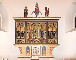 Der Flügelaltar wurde vermutlich aus zwei anderen Altären zusammengefügt. Sein Aufsatz besteht aus einem mittleren Teil mit der Darstellung der Maria mit dem Jesuskind, flankiert von den Heiligenfiguren Katharina und Margarete. Die Flügel stellen vier Heilige dar. Die Predella enthält neben dem um 1550 eingefügten zentralen Gipsrelief mit der Kreuzigungsszene zwei weibliche Büsten. Auf der Rückseite des Altars befinden sich die plastisch gearbeiteten Evangelisten Markus mit einem Löwen und Lukas mit Stier.