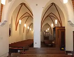 Die beiden Kirchenschiffe besitzen seit den Erweiterungsbauten eine gotische Einwölbung. Vier quadratische Kreuzrippengewölbe ruhen auf eckigen leicht abgerundeten ungeschmückten Säulen. An den Seiten erhält der Kirchenraum durch je drei Fenster Tageslicht. Der eingezogene quadratische Chor enthält den Altarbereich, der über zwei seitliche Spitzbogenfenster belichtet wird. Neben dem Altarraum befindet sich eine spätgotische Sakramentsnische. Auf der Nordseite des Chores gibt es eine Priesterpforte, die aus der ersten Bauzeit stammt. Nach Umbauten sind im Mauerwerk das Südportal im Langhaus sowie die ursprünglich größeren Fenster noch erkennbar.