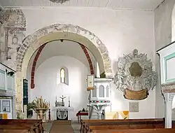 Die Decke im Saal ist durch feine Stuckleisten gegliedert. Im Süden und Westen sind zweigeschossige Emporen angeordnet. An der Wand neben dem Triumphbogen wurden mittelalterliche Wandmalereien freigelegt. Die aus dem 13. Jahrhundert stammende Sakristei ist mit einem Tonnengewölbe abgeschlossen.