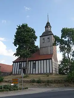 Die Wände der 1735 gebauten und 1988/89 restaurierten Fachwerkkirche wurden mit Ausnahme des Dachturms im Westen in Ständerbauweise erbaut. Sie bestehen aus enggestellten Ständern ohne Verstrebung, deren Gefache mit Backsteinen ausgefüllt sind. Im Süden des Langhauses befindet sich ein zweigeschossiger Anbau, der die Patronatslogen beherbergt. Der Dachturm ist mit einer schiefergedeckten Glockenhaube bedeckt, die eine Laterne trägt.