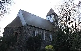 - ↑ Eine ähnliche erhöhte Randlage zum Dorfkern, geschützt durch einen See, findet sich auch bei der Dorfkirche Britz.