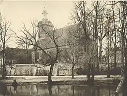 Die heutige Kirche lag von Anfang an abseits des Dorfkerns, in markanter Höhenlage innerhalb eines ummauerten Kirchhofs zwischen ursprünglich vier Seen.[1] Nur noch zwei dieser Seen (Klarensee und Wilhelmsteich) sind heute im Alten Park und im Lehnepark vorhanden; der unter dem heutigen Reinhardtplatz gelegene Teich wurde um 1900 zugunsten einer Marktfläche zu- und aufgeschüttet. Es ist unklar, ob zunächst der Komturhof oder das Dorf oder beide gleichzeitig entstanden.