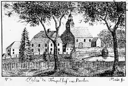 Tempelhof gehörte im Spätmittelalter zur Sedes[3] Spandau (um 1500, 1527), aktuell zum Kirchenkreis Tempelhof. Es war ursprünglich selbstständige Pfarre mit Tochterkirchen in Rixdorf sowie 1541 in Mariendorf. Von 1693 bis 1893 gehörte Tempelhof als Mater Vagans[4] zu Britz; seither ist es wieder selbstständige Kirchengemeinde. Tempelhof war mit nur einer Kirchenhufe ausgestattet (1450, 1480, 1541). Das Patronat besaß der Templer-, seit 1318 der Johanniterorden. 1546 kam es an die Städte Berlin-Kölln, die Tempelhof bereits 1435 von den Johannitern erworben hatten, und ab 1590 an Cölln allein. Seit 1601 hatten es die jeweiligen Gutsbesitzer: zunächst Kurfürst Joachim Friedrich bis zu seinem Tode 1608, ab 1716/1717 der Wirklich Geheime Kabinettsrat und Kriegssekretarius Levin von Scharden, seit 1749 der Geheime Finanzrat Carl Franz von Reinhardt (nach dem der Platz vor der Kirche benannt ist), seit 1776 Major von Schau, von 1796 bis 1804 Graf von Podewils, vor 1816 bis 1863 Fürst Otto Hermann von Schönburg und Erben, von 1863 bis 1871 der Bankier Friedrich Carl Heinrich Ferdinand Jacques. Sichere Nachweise für das wiederholt angenommene Katharinenpatrozinium gibt es nicht.