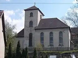 Die Dorfkirche und der Friedhof befinden sich nahe der Seitenschlucht, wo sich einst die Burg befand.