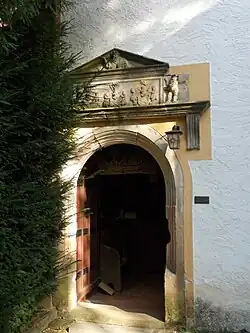 Die Saalkirche von 1582 ist ein anschauliches Beispiel für eine reich ausgestattete Patronatskirche; sie erhielt im 17. Jahrhundert Anbauten. Das Bauwerk ist ein verputzter Bruchsteinbau mit Dreiachtelschluss. Die Sakristei und die Gruft sind an der Nordseite angebaut; ein kleiner Fachwerkturm führt an der Südseite zu den Logen. Über dem einfach profilierten Südportal ist ein von Putten flankiertes Wappenfeld mit der Jahreszahl 1582 im Giebelaufsatz angeordnet. Der Westturm über quadratischem Grundriss ist im Obergeschoss oktogonal ausgebildet, mit einer geschweiften Haube als Abschluss und einem großen Wappenstein über dem Portal.