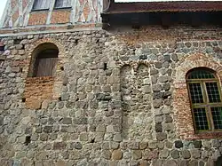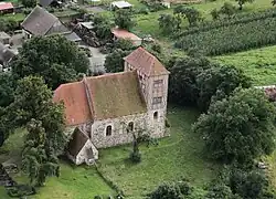 Bei der Kirche handelt es sich um einen rechteckigen Feldsteinbau mit eingezogenem rechteckigem Chor und querrechteckigem Westturm auf Breite des Langhauses. Nach Norden ist eine tonnengewölbte Sakristei angebaut. Die östliche Außenwand des Chors weist eine Blende mit gestaffelter Dreifenstergruppe (Dreieinigkeits-Fenster) auf, die Längswände von Chor und Langhaus haben zwischen den Fenstern Spitzbogenblenden. Die rundbogigen Fenster des Langhauses und die Kreuzgratgewölbe im Inneren rühren von baulichen Veränderungen im Stil der Renaissance um 1566 her. Dabei wurde das Langhaus mit einem Mittelpfeiler eingewölbt, wodurch ein Einstützenraum entstanden ist. Der Turmaufsatz in Fachwerkbauweise wurde um 1700 erneuert.