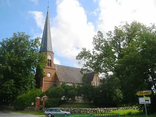 Die vierjochige Kirche ist eine für die Region typische Feldsteinkirche. Der 47 Meter hohe Turm wurde aus Backstein 1892 an Stelle eines zuvor vorhandenen, separaten Holzturms errichtet und verfügt über ein achteckiges Obergeschoss mit einem Spitzhelm. In ihm befinden sich zwei Glocken. Das zweite Südfenster weist auf Christus hin, das Dritte zeigt Geburt, Taufe, Kreuz und Auferstehung. Im Innenraum sind Teile der neugotischen Innenausstattung, eine Orgel sowie ein Grabstein mit einer Inschrift aus dem Jahr 1580 erhalten. Der Grabstein ist mit den Wappen der Familien von Preen, von Levetzow und von Bützow verziert. Sehenswert ist auch ein Taufstein aus dem Jahr 1858 mit einer Messingschale von 1650, eine Treibarbeit von Lengfeld. An den Großherzog erinnert eine Gedenktafel mit der Inschrift „Zu Ehren Gottes ist diese Kirche vom Großherzog Friedrich Franz III. in den Jahren 1893–1895 erneuert, ausgebaut und reich geschmückt, aus Dankbarkeit für gnädige Errettung aus schwerer Krankheit, uns in dessen Gegenwart im Jahre der Trauer um den Heimgegangenen, ihren vielgeliebten, teuren Herren – a.D. – diese Tafel gestiftet.“. Die große Glocke von 1584 goss Harmen Hogehus.
