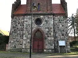 Der Kirchturm ist wenige Zentimeter breiter als das Schiff und hat einen querrechteckigen Grundriss. Er wurde im unteren Geschoss aus Feldsteinen errichtet, darüber aus Ziegeln. An der Nord- und Südseite ist ein hochgesetztes Ochsenauge. Nach Westen wurde der Turm im Bereich des Turmgeschosses um einige weitere Zentimeter nach Westen verlängert. Dort sitzt ein großes, spitzbogenförmiges Portal, darüber ein Ochsenauge. Oberhalb ist ein quergestelltes Satteldach sowie an beiden Seiten ein mit Fialen verzierter Giebel. Im mittleren, bereits aus Ziegeln erstellten Geschoss, ist an der Nordseite zunächst ein schmales, spitzbogenförmiges Fenster, darüber zwei weitere Fenster. Dieser Bereich ist an den Ecken mit Lisenen gegliedert. Oberhalb eines Gesimses sind an den vier Seiten je eine profilierte Klangarkade. Oberhalb eines weiteren Gesimses ist ein geknickter Turmhelm mit je einer Turmuhr im Giebel. Der Turm schließt mit Turmkugel und Kreuz ab.