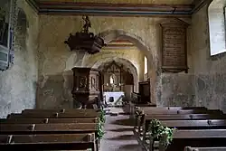 Holzbalkendecken in Schiff und Chor sind schlicht gestaltet. Im rundbogigen Triumphbogen befindet sich eine hölzerne Kanzel aus dem Jahr 1720. Der geschnitzte polygonale Korb der Kanzel wird von einer Mosesfigur getragen. Am Aufgang zur Kanzel befindet sich ein Monogramm der Stifter Heinrich von Schildt und seiner Ehefrau Juliane Rosimunde, geborene von Britzke. Die Westempore wurde 1727 errichtet und im 19. Jahrhundert verändert. Auf der Empore befindet sich ein kleines defektes Harmonium. An den Wänden sind an verschiedenen Stellen Reste alter romanischer Wandmalerei zu erkennen. Diese wurden teilweise im 19. Jahrhundert erweitert.