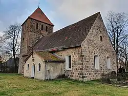 Das ursprüngliche Gebäude ist ein 20 m langer und 10 m breiter rechteckiger Feldsteinsaal aus der ersten Hälfte des 13. Jahrhunderts. Es hat einen flachen Ostabschluss und trägt ein Spitzdach. Die Kirche hatte im Süden ein vermauertes Rundbogenportal in spitzer Wandblende und Spitzbogenportal.