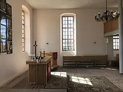 Die Kirchenausstattung stammt aus der Bauzeit. Im Innenraum ist eine Hufeisenempore, darauf eine Orgel von Hermann Teschner. Der Fußboden ist mit quadratischen Keramikplatten ausgelegt. Das Bauwerk trägt im Innenraum eine flache Putzdecke. Seit 2008 hängt an der östlichen Chorwand ein 13-teiliges Altarbild mit dem Titel Dona nobis pacem. Es geht auf einen Entwurf zurück, den Erwin Hahs im Jahr 1955 erstellte.