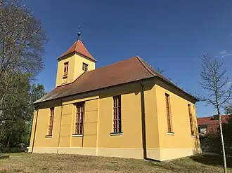 Das Bauwerk entstand im Wesentlichen aus Mauersteinen, die anschließend verputzt wurden. Der Chor ist gerade und nicht eingezogen. An der Ostseite sind zwei schmale und hochrechteckige Fenster. Zwei dieser Fenster finden sich auch im westlichen und östlichen Bereich des Langhauses an der Nordseite des Kirchenschiffs. Mittig ist eine kleine und hochrechteckige Pforte, die von einer schlichten Putzgliederung eingefasst ist. Oberhalb der Pforte ist ein kleines und quadratisches Fenster. Die Südseite wurde mit drei Fenstern gestaltet. Mittig ist ebenfalls eine sparsame Putzgliederung, die aus dem Baukörper heraustritt. Dieses Stilelement wurde auch an der Westseite genutzt. Dort ist eine rechteckige Pforte, darüber ein kleines und quadratisches Fenster. Am Übergang zum Dach ist eine umlaufende Voute. Sie geht an der Westseite in ein Gesims über. Oberhalb sind ein weiteres, quadratisches Fenster sowie eine kleine, querrechteckige Blende. Im quadratischen Kirchturm ist an der Westseite ein hochrechteckiges Fenster, an der Ostseite ein kleines quergestelltes Fenster. An der Nord- und Südseite ist je eine hochrechteckige Klangarkade. Der Turm schließt mit einem Pyramidendach mit Turmkugel und Wetterfahne ab.