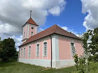 Die Kirche ist ein verputzter Saalbau, der auf einem umlaufenden und ebenfalls verputzten Sockel errichtet wurde. Das Kirchenschiff erscheint in einem weiß-rosafarbenen Ton und besitzt einen rechteckigen Grundriss. An der Ostwand ist mittig ein gedrückt-segmentbogenförmiges Fenster mit einer aufgeputzten Laibung sowie oberhalb einem mittig angebrachten Schlussstein. Am Übergang zum Dach ist ein umlaufender Fries. An der Südseite des Langhauses sind fünf, an der Nordseite vier gleichartige Fenster. Dort ist mittig eine rundbogenförmige Pforte, darüber ein kleineres Fenster, das jedoch identisch gestaltet wurde.