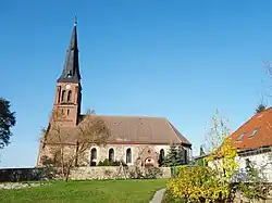 Das Langhaus und das Erdgeschoss des etwas breiteren Kirchturms im Westen wurden in der zweiten Hälfte des 13. Jahrhunderts aus Feldsteinen gebaut. Der Chor im Osten mit Fünfachtelschluss wurde 1724 angefügt. Außerdem wurden die Fenster als Bogenfenster erneuert. Bei der Wiederherstellung der durch einen Brand 1892 zerstörten Feldsteinkirche wurde das Erdgeschoss des Kirchturms durch Strebepfeiler abgestützt, mit zwei quadratischen Geschossen aus Backsteinen aufgestockt und mit einem hohen spitzen Helm bedeckt. Das oberste Geschoss des Kirchturms beherbergt die Turmuhr und hinter den als Biforien gestalteten Klangarkaden den Glockenstuhl.