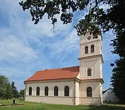 Die klassizistische Dorfkirche ist dreigestaltet. Im Süden steht ein dreistöckiger Turm. Diesem schließt sich das Kirchenschiff an, an der nördlichen Außenwand befindet sich eine fünfseitige polygonale Apsis. Das Schiff hat nach Osten und Westen jeweils fünf Rundbogenfenster, die profiliert umrandet und leicht verdacht sind. Horizontale Strukturelemente sind Gesimse, welche unter den Fenstern und unter der Traufe verlaufen, und die sich auf die giebelseitigen Wände, den Tur und die Apsis fortsetzen, also verkröpft um den Kirchenbau verlaufen. Die Apsis ist schlicht. Zwei Rundbogenfenster weisen nach Nordosten und Nordwesten.