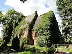 Die Kirche ist ein gedrungenes, nicht einheitliches Backsteinbauwerk auf einem Sockel aus Feldstein, das vermutlich aus dem 14. Jahrhundert stammt. Der leicht eingezogene, querrechteckige Chor mit Blendengiebeln im Osten und im Westen über dem Chorbogen ist mit einem Kreuzrippengewölbe geschlossen, das mit Bandrippen begonnen und mit Birnstäben beendet wurde; an der Südseite ist eine Priesterpforte in einer flachen Mauervorlage mit abgetrepptem Gewände angeordnet. Das flachgedeckte Schiff ist mit Stützpfeilern und mit einer Nordwand aus Feldstein versehen. Im Jahr 1902 wurden die Westwand in Naturstein, die Vorhalle und der Blendengiebel in Backstein sowie der östliche Schiffsgiebel und die Fenster erneuert. Das Bauwerk ist stark mit Kletterpflanzen bewachsen, was Spreng- und Feuchteschäden infolge eindringender Wurzeln zur Folge hat.[1] In unmittelbarer Nähe der Kirche sind zwei Trogmühlen erhalten.[2]