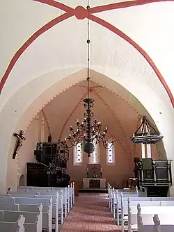 Im Innern der Kirche sind sowohl der Chor als auch das Langhaus gewölbt, der Chor mit einem hoch ansteigenden Kreuzrippengewölbe aus der Bauzeit der Kirche, das Schiff mit zwei Kreuzgratgewölben vom Ende des 17. Jahrhunderts. Zuvor hatte das Schiff seit seiner Errichtung wahrscheinlich eine Flachdecke, wie die Reste einer mittelalterlichen Quaderbemalung an den jetzt über den Gewölben im Dachraum sichtbaren Partien der Seitenwände erkennen lassen.[13] Chor und Langhaus sind durch einen spitzbogigen Triumphbogen getrennt.