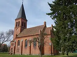 Die Grundmauern bestehen aus teils gequaderten Feldsteinen, die tragenden Wände aus roten Ziegeln. Die Fassade des Kirchenschiffs wird durch Strebepfeiler und rundbogige Fensteröffnungen gegliedert. Den Abschluss des Schiffs bildet eine gerade Wand, die von zwei an den Ecken angeordneten Strebepfeilern gestützt wird. Zur Ausstattung gehört eine hölzerne, polygonale Kanzel mit gewundenen Ecksäulchen, die in der zweiten Hälfte des 17. Jahrhunderts gefertigt und Ende des 19. Jahrhunderts überarbeitet wurde. Im Glockenstuhl hängt eine Bronzeglocke, die 1799 durch den Glockengießer Friedrich Thiele hergestellt wurde.