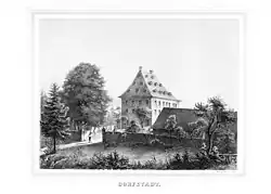 Dorfstadt wurde im Jahr 1460 unter dem Namen „Dorffstad“ erwähnt.[2] Die Grundherrschaft über den Ort lag um 1583 bei den Rittergütern Falkenstein und Auerbach unteren Teils. Im Jahr 1764 war die Grundherrschaft sogar unter die sieben Rittergüter Auerbach unteren Teils, Falkenstein oberen Teils und Mühlberg, Oberlauterbach, Sorga, Rützengrün, und Dorfstadt geteilt.[3] Das existierende Herrenhaus in Dorfstadt wurde vermutlich 1551 errichtet. Dieses gutsherrschaftliche Anwesen lag im Besitz der Familie von Trützschler. Zu einem späteren Zeitpunkt erfolgte der Bau der benachbarten Wirtschaftsgebäude in Klinkerbauweise und eine partielle Umgestaltung des Herrenhauses mit Erweiterung durch ein zweites Obergeschoss. Die äußere Fassadengliederung im zweiten Obergeschoss besitzt mit Lisenen und Rundbögen eine Gestaltung aus dem 19. Jahrhundert. Im Erdgeschoss zeigen Stuckdecken eine barocke Ausgestaltung an.[4]