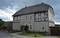Traufständig an der Straße steht das zweigeschossige Wohnhaus des Hofs. In seiner heutigen Form besteht der Hof seit dem späten 19. Jahrhundert, geht in seinem Kern jedoch auf noch frühere Zeiten zurück. Die mittleren drei Achsen der siebenachsigen Fassade treten als flacher Mittelrisalit hervor. Das obere Stockwerk ist in Fachwerkbauweise errichtet, bedeckt ist der Bau mit einem Krüppelwalmdach. Bemerkenswert sind die im Original erhaltenen Fenster (Stand 2005).