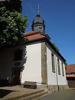 Die 1717–1718 an der Stelle einer bereits im Jahre 1316 erstmals erwähnten Sankt Matthäi Kapelle erbaute und 1999 aufwändig sanierte Kirche in der Mitte des Dorfes, mit Mansarddach und barockem Dachreiter-Glockenturm. Auf den Emporen wurden im Barock emblematische bildliche Darstellungen und Zitate nach Vorlage der „Emblemata sacra“ des Daniel Cramer aufgebracht.[10] Ein Leben und Sterben unter christlichen Ideen spielt bei allen Emblemen eine zentrale Rolle. Auch die Kirchenbänke fallen farblich aus dem üblichen Rahmen; sie sind marmoriert, und ihr Farbenspektrum reicht von dunkelbraun über rotbraun bis flaschengrün. Viele Bänke tragen noch heute die Namen der Familien, die früher auf ihnen ihren angestammten Platz hatten. Alle Malereien an den Ausstattungsstücken wurden 1964 überarbeitet. Die Wandmalereien an der Kopfwand und der Fensterseite wurden erst 1975 bei der Sanierung der Bausubstanz unter dem Kalkputz entdeckt und dann restauriert. Weitere Malereien befinden sich unter dem weißen Anstrich der Decke und erwarten ihre Freilegung und Restaurierung.