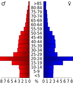 20,4 Prozent der Bevölkerung waren unter 18 Jahre alt. 26,4 Prozent zwischen 18 und 24 Jahre, 28,3 Prozent zwischen 25 und 44 Jahre, 16,9 Prozent zwischen 45 und 64 Jahre und 7,9 Prozent waren 65 Jahre alt oder älter. Das Durchschnittsalter betrug 27 Jahre. Auf 100 weibliche Personen kamen 98,7 männliche Personen. Auf 100 erwachsene Frauen ab 18 Jahren kamen 97,7 Männer.