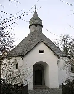 Von außen wirkt die Kapelle recht unauffällig: ein polygonaler Zentralbau mit zwei sichtbaren Anbauten (Vorhalle und Apsis), abgeschlossen von einem schiefergedeckten Dach, bekrönt von einem kleinen Glockentürmchen.