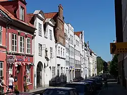 Unter Denkmalschutz stehen die Gebäude mit den Hausnummern 13, 21, das Hermberg’sche Haus, 25, 27, 31–41, 49–55, 65–71 ungerade und den Hausnummern 22, 32–42, 48, 58, 64, 68 und 76–78 gerade. Hervorzuheben ist der Stiftungshof Haasen-Hof (Nr. 37–39) als einer der typischen Lübecker Gänge und Höfe. Er wurde 1725 von der Weinhändlerswitwe Elisabeth Haase errichtet. Sie ließ das Wohnstift mit 13 Wohnungen für Witwen und ledige Frauen bauen.