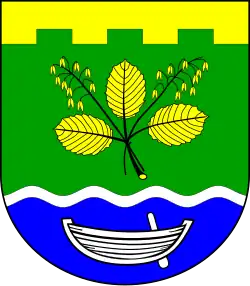 Blasonierung: „Unter einem goldenen Zinnenschildhaupt durch einen schmalen silbernen Wellenbalken von Grün und Blau geteilt. Oben zwei fächerförmig gestellte goldene Haferrispen zwischen drei goldenen Buchenblätter, unten ein silbernes Boot mit seitlichem Steuerruder.“[7]