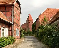 Die mittelalterliche Pfarrkirche Johannis-der-Täufer steht mitten im Ortskern des Fleckens.