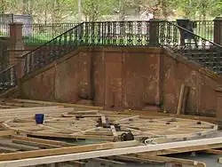 - „Man denke sich das ganze Podium leer, alle Kulissen herausgenommen. Der nackte Boden enthält eine drehbare, runde Scheibe, die einen so großen Kreis bildet, daß derselbe vom Souffleurkasten bis zur hintersten Tiefe des Theaters, und links und rechts nahe bis an die Seitenwände reicht. Auf der vorderen Hälfte dieses Kreises nun stellt man die erste Dekoration des Stückes auf: sie schaut dem Publikum gerade ins Gesicht. Dahinter steht Rücken an Rücken mit der ersten Scenerie, auf der bisher verdeckt gewesenen Hälfte der Drehscheibe, bereits die zweite Dekoration fertig.