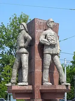 Nach Abschluss der Umgestaltung des Bahnhofsvorplatzes schlug der Leiter des Emschertal-Museums, Alexander von Knorre, den Platz vor dem Bahnhof als neuen Standort vor. Um die originale Figurengruppe nicht zu gefährden, einigte sich der Stadtrat schließlich darauf, Nachbildungen durch eine Bochumer Restaurierungswerkstatt fertigen zu lassen. Am 12. August 2003 wurden die Repliken als historische Symbole der Wanne-Eickeler Wirtschaft auf dem Heinz-Rühmann-Platz aufgestellt. Die etwa 1,70 Meter großen Statuen aus mit Dolomitsplit versetztem Beton und einer Monierung aus Edelstahl wurden nicht, wie ursprünglich nebeneinander, sondern auf einer 3,80 Meter hohen, mit rippenförmigen Vorsprüngen versehenen Dreiecksäule angeordnet.[4]