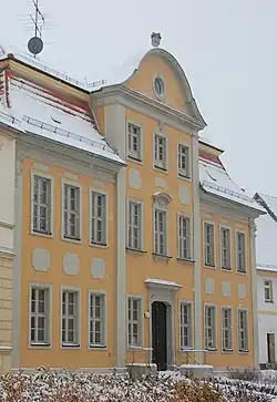Das zweigeschossige, repräsentative Gebäude entstand in der Zeit um 1725 im Stil des Barock. Auf seiner Westseite wird der neunachsige Bau durch einen dreiachsigen, von einem Giebel bekrönten Mittelrisalit geprägt. Der Risalit wird seitlich durch kolossale Lisenen begrenzt. Mittig besteht hier ein Vasenaufsatz. Die Fassade wird durch Stuckelemente und Putzspiegel gegliedert und verziert. Es besteht eine seitliche Begrenzung durch kolossale Pilaster. Die Phantasiekapitelle verweisen auf Dresdener Vorbilder. An der zur Baderstraße ausgerichteten Fassade sind die Achsen durch Kolossalpilaster voneinander abgetrennt. Bedeckt wird das Gebäude von einem Mansarddach. Ein angrenzender Wirtschaftsflügel stammt bereits aus dem Jahr 1692.
