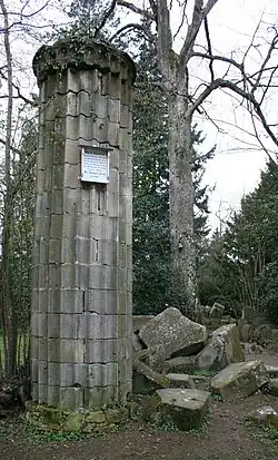 Von den drei Säulen der Tempelruine steht nur noch eine aufrecht inmitten eines Trümmerfelds. Bei einem Spaziergang wurde Ludwig Uhland 1814 angesichts der verfallenen Ruine zu seiner Ballade „Des Sängers Fluch“ angeregt.