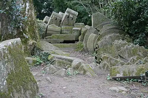 - „Sie sind sehr wahrscheinlich als Nachahmung der Ueberbleibsel von dem Tempel des donnernden Jupiters am Fuß des capitolinischen Berges in Rom, hierher gesezt worden, ohne daß sie solche gerade vorstellen, sondern nur einen etwas ähnlichen Effect hervorbringen sollten.“