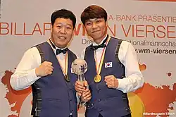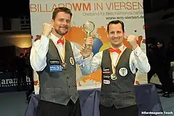 2016 wurde zur Entscheidungsfindung bei unentschiedenen Matches ein neues System eingeführt, die „Scotch Doubles“. Ab 2017 wird nun die gesamte Weltmeisterschaft in dieser Form ausgerichtet. Das bedeutet, dass nicht mehr jeder Spieler der Teams eine Partie absolviert, sondern dass die Spieler einer Mannschaft zusammen am Billard agieren. Das anfangende Team beginnt mit dem weißen Ball von der Anfangsposition und kann frei wählen, wer den ersten Stoß ausführt. Nach jedem erfolgreichen Stoß ist der Partner an der Reihe. Es wird somit abwechselnd gespielt – pro Spieler immer nur ein Stoß, bis die Aufnahme beendet ist. Jetzt verfährt die gegnerische Mannschaft entsprechend. Jedes am Stoß befindliche Team bleibt zusammen am Billard, eine Beratung untereinander ist erlaubt unter Berücksichtigung des Zeitlimits. Es wird mit Nachstoß gespielt, wenn das beginnende Team zuerst das Spielziel von 40 Punkten erreicht. Sollte ab dem Viertelfinale ein Match unentschieden ausgehen, erfolgt ein Entscheidungssatz (ohne Nachstoß) bis 15 Punkte.