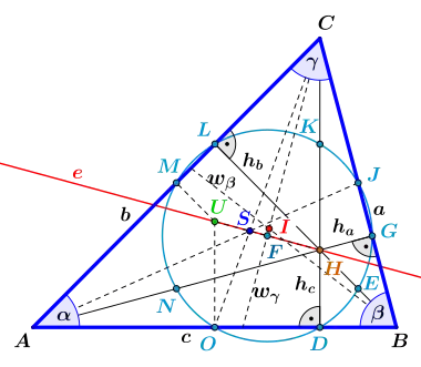 • Feuerbachkreis mit Mittelpunkt F (hellblau) durch die 9 Schnittpunkte O, D, E, G, J, K, L, M und N