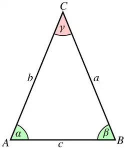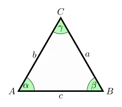 In der Geometrie werden die Eckpunkte des Dreiecks in der Regel mit , und bezeichnet, üblicherweise so wie abgebildet, gegen den Uhrzeigersinn. Die Seite, die einer Ecke gegenüberliegt, wird analog , bzw. genannt. Damit liegt z. B. die Seite dem Eckpunkt gegenüber, verbindet also die Punkte und . Häufig wird mit , und auch stattdessen die Länge der jeweiligen Seite , oder bezeichnet. Die Winkel werden , und genannt. ist der Winkel am Eckpunkt , liegt am Eckpunkt und liegt am Eckpunkt