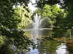 Zum Freizeitangebot des Parks gehören ein großer Teich, ein Springbrunnen und ein Spielplatz.